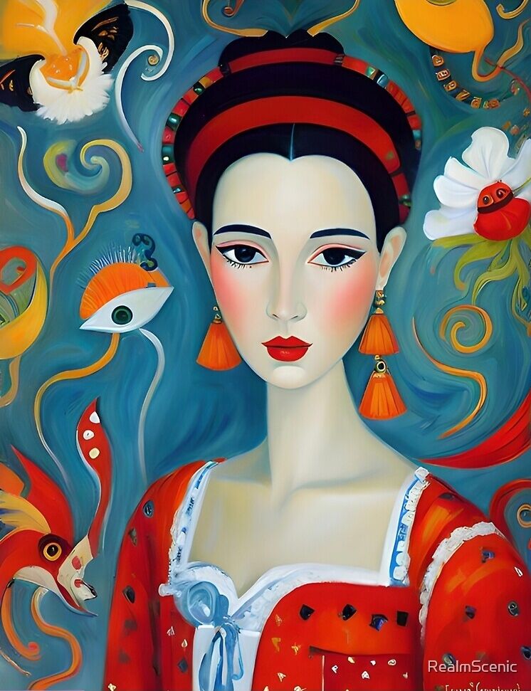 A painting of a woman with long black hair, red headband and dress, beautiful Tatar woman, an ultrafine detailed portrait of Tatyana. Naive art. ⓘ My logo is not printed on products.