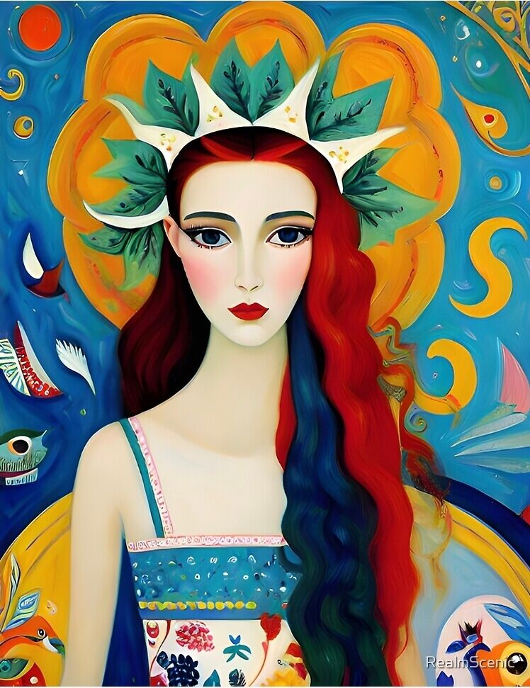 A painting of a stunning American woman with long red hair, red blue color scheme, portrait of Ashley, inspired by Lady Liberty. Naive art. ⓘ My logo is not printed on products.