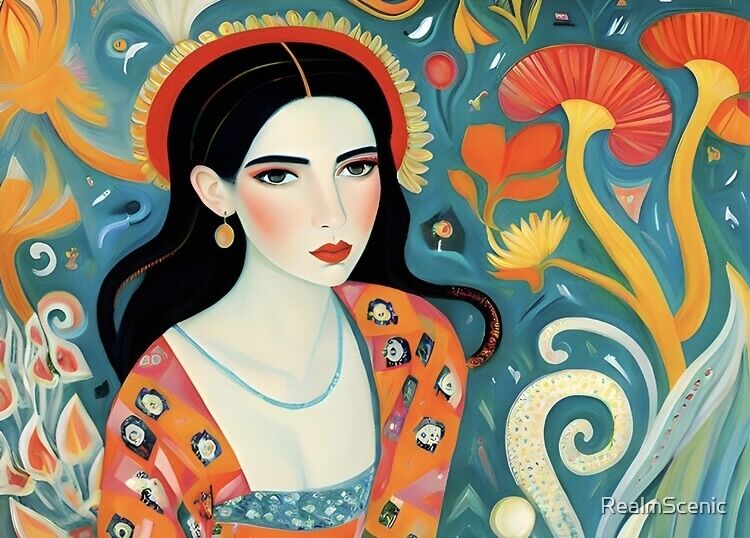 A painting of a young woman surrounded by flowers, orange blooming flowers garden, Genghis Khan wife, red poppies. Visual art. ⓘ My logo is not printed on products.