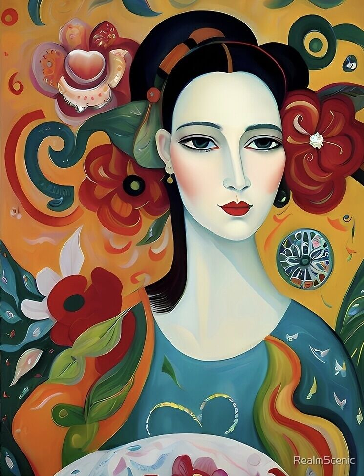 A painting of an Austrian woman holding a plate of food, flower in hair, expressive eyes, connectedness, portrait of Sophia. Visual art. ⓘ My logo is not printed on products.