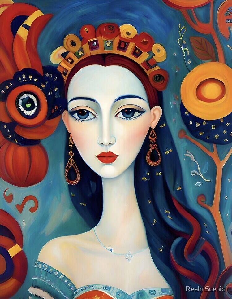A painting of a woman with a crown on her head, balanced colors, the goddess of autumn harvest, portrait of Demeter, blue and red color palette, connectedness. Naive art. ⓘ My logo is not printed on products.