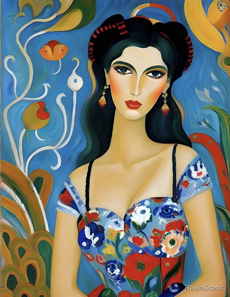 A portrait of Anya, a beautiful Ukrainian maiden in a red dress and two blue braids. The painting is in a naive style, with a stylized beauty portrait. This painting is a celebration of Ukrainian culture and beauty. ⓘ logo is not printed on products.