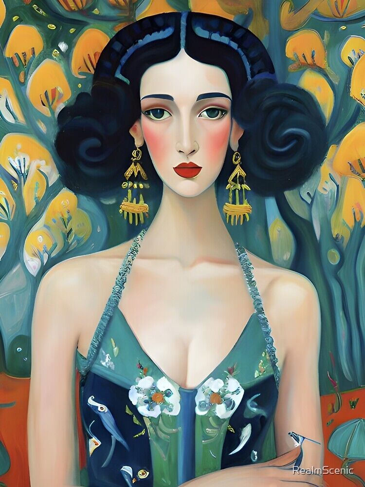 A beautiful Iranian woman with long dark hair, feminine shapes, a detailed face with red lips, in a hyperrealistic, naive art style. This painting is a celebration of the beauty and culture of Iran. ⓘ My logo is not printed on products.