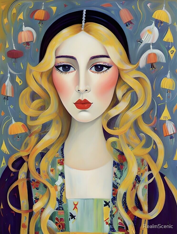 A painting of an Israeli woman with long blonde hair, beautiful jewish woman. Portrait of Velvela. Naive art. ⓘ My logo is not printed on products.